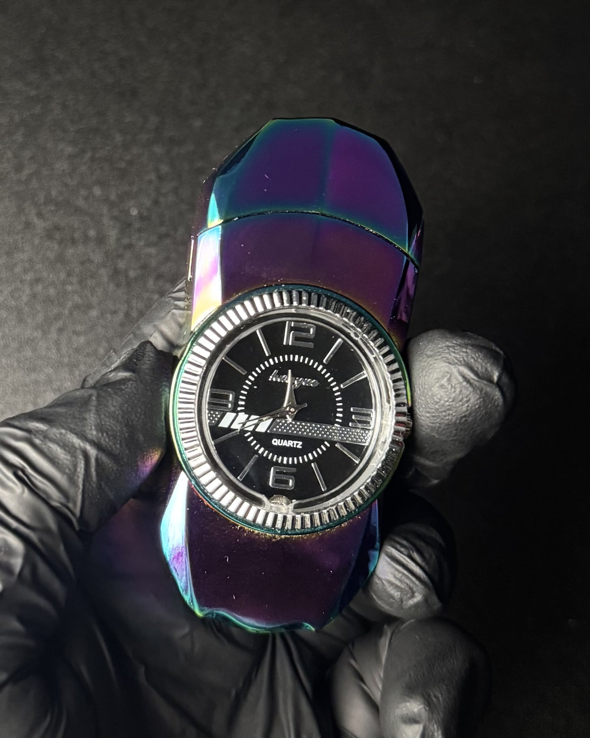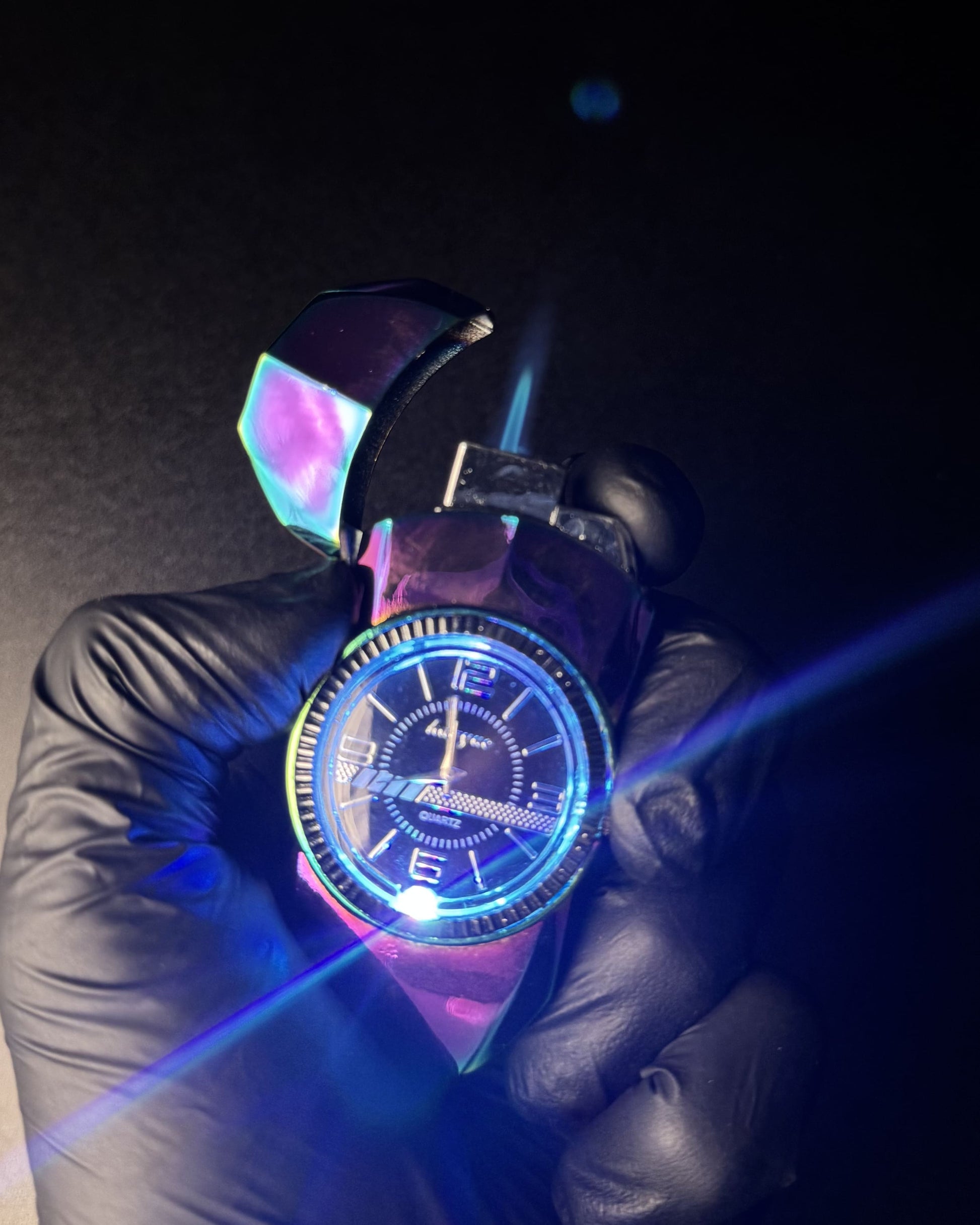 În partea frontală este integrat un ceas cu mecanism quartz complet funcțional, protejat de un cadru metalic solid — un detaliu rar întâlnit la o brichetă.